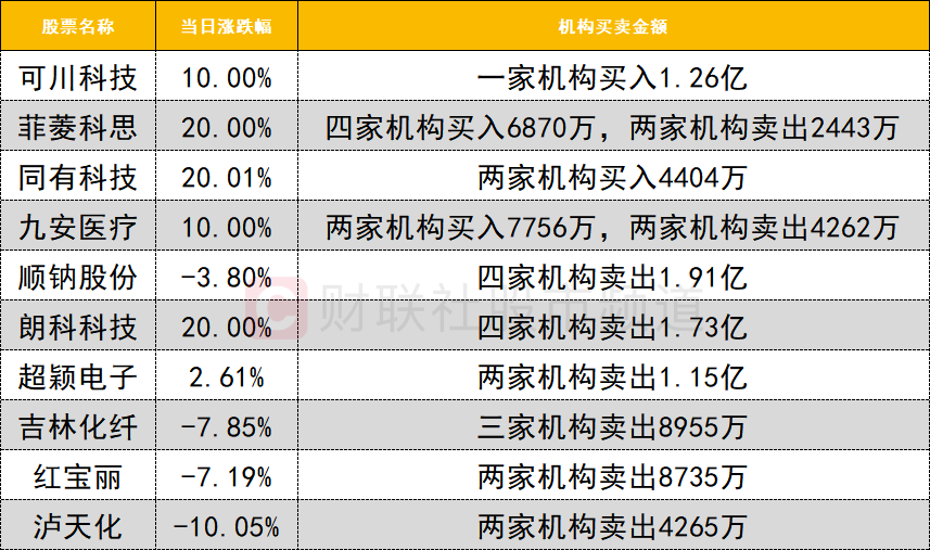 今日龙虎榜机构活跃度一般,买入个股数量和净买入规模依旧较低。九安医疗强势涨停,获两家机构买入7756万,同时遭两家机构卖出4262万。CPO概念股可川科技走出3天2板,获一家机构买入1.26亿。朗科科技遭四家机构卖出1.73亿,深股通卖出1.01亿。