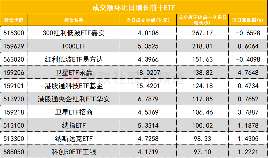 从成交额环比增长前十的ETF来看,300红利低波ETF嘉实(515300)成交额环比增长267%位居首位;1000ETF(159629)成交额环比增长218%位居次席。