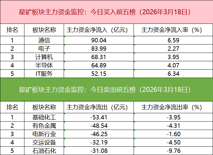 从主力板块资金监控数据来看,通信板块主力资金净流入居首。