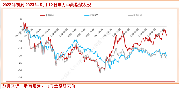 2023年1月,市场对中药板块业绩持续性出现观点分歧,导致中药指数出现回调,而2023Q1业绩的确定性再度催化中药板块股价持续提升,2023年初至5月12日,中药指数上涨13.3%,在医药子行业中排名第一。国企改革、营销改革、疫情用药等因素催化板块放量提速,中药板块具有全年业绩提升的可能性。