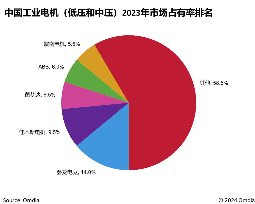 对于工业电机制造商而言,本土和国际品牌制造商在面对市场下行压力时,也纷纷采取了积极的应对策略。本土品牌制造商们一方面深耕优势细分市场,另一方面积极拓展新兴行业机会。卧龙电驱在稳固其在油气、石化、矿山等传统行业的市场地位外,大力开发可再生能源行业,风电储氢等领域,以拓宽其盈利渠道。国际品牌制造商为更好的应对本土工业电机厂商带来的竞争压力,更加积极的开展本地化布局,以稳固和扩大其在中国的业务版图。2024年,WEG宣布将投资约6200万美元在中国如皋地区建立制造基地。茵梦达宣布在中国天津建立电机生产基地和研发中心,新增面向海工装备、水泵用电机、矿用电机等产品线,预计2026年初投入使用。Omdia 预测,未来几年,中国工业中低压电机市场竞争将更加白热化。