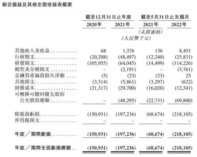 财务数据显示,2020年、2021年及2022年前5月,真实生物其他收入及收益分别是6.8万元、137.6万元、845.1万元,期间分别亏损1.51亿元、1.97亿元、2.18亿元。