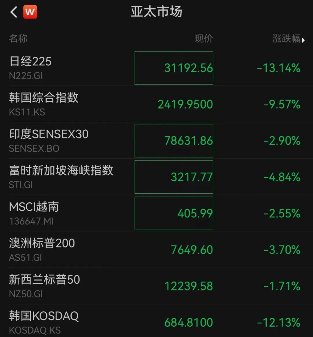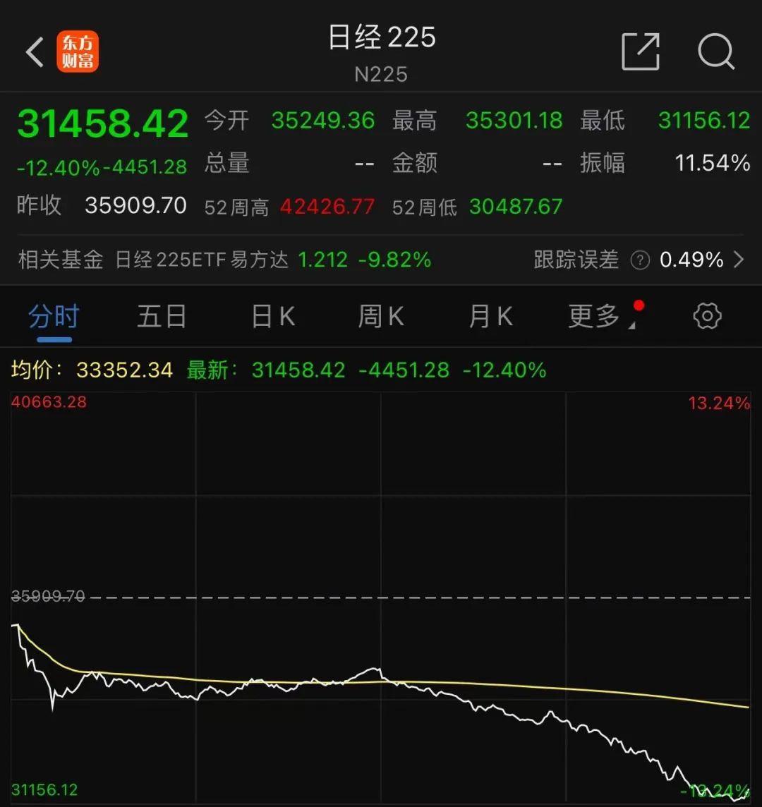 截至收盘,日经225指数收跌12.4%,日内跌超4400点。