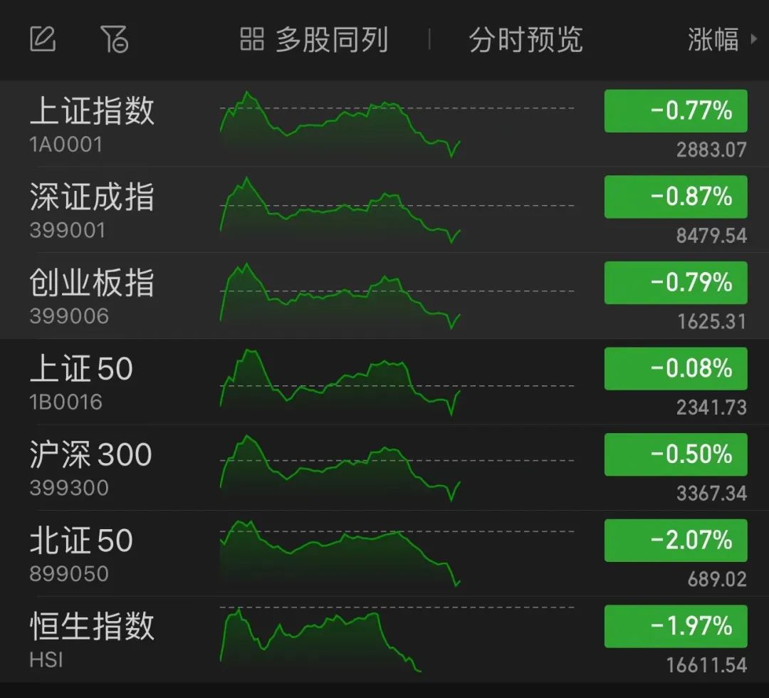 A股早盘相对坚挺,午后跌幅有所扩大。沪指、深成指、创业板指均一度跌超1%。消费电子、算力、半导体芯片等方向跌幅居前,沪深北三市下跌个股近4200只。
