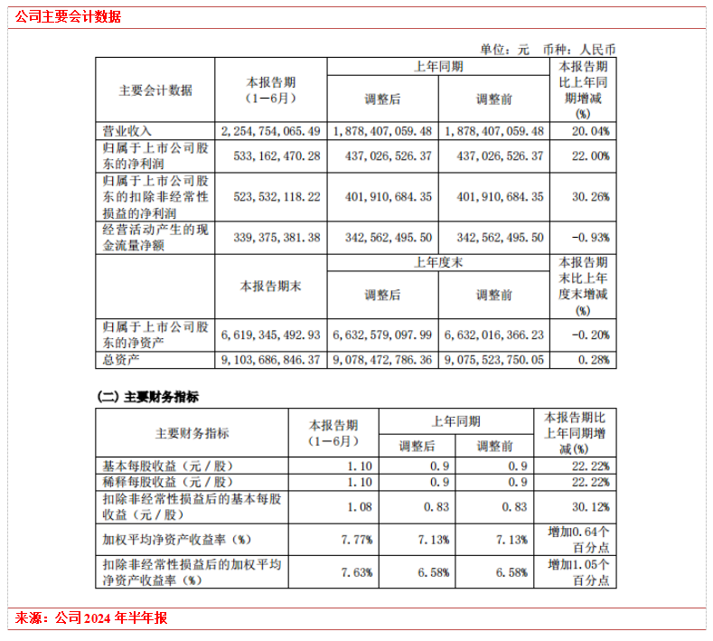 上半年实现营收22.55亿元,同比增长20.04%;净利润5.33亿元,同比增长22%,营业收入和净利润再创同期新高。扣除非净利润5.24亿元,同比增长30.26%。经营现金流净额3.39亿元,同比-0.93%。基本每股收益1.10元/股,同比+22.22%。