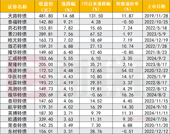 图:7月来涨势前20的转债个券表现
