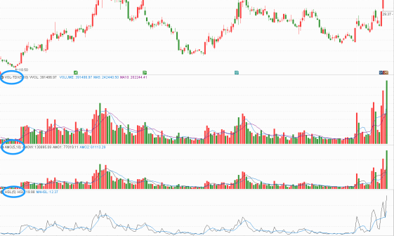 成交股数(VOL),我们常讲的成交量,适合最同一只个股进行纵向比较,来反映资金买卖的活跃程度;