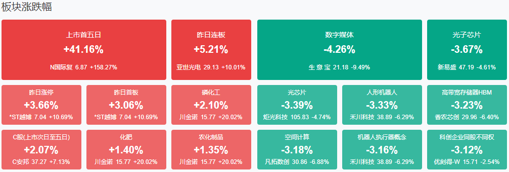 板块方面,PEEK材料、磷化工、贵金属、ST板块等板块涨幅居前,CPO、多模态、半导体、数据要素等板块跌幅居前。