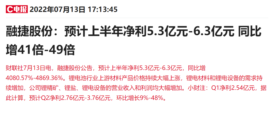 总市值近400亿元的融捷股份晚间公告,预计上半年净利5.3亿元-6.3亿元,同比增长4080.57%-4869.36%。