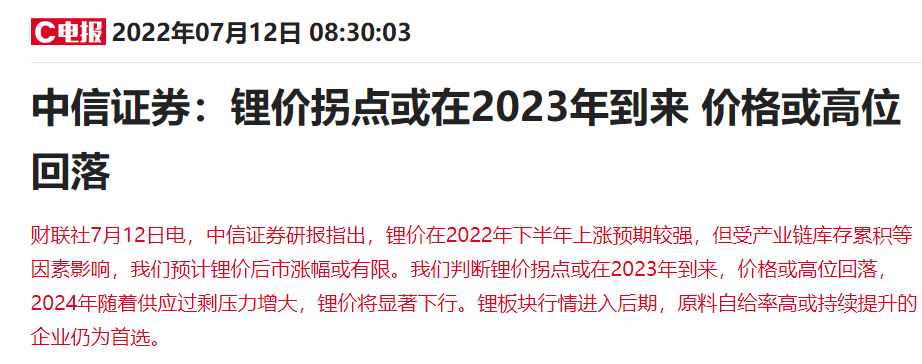 去年下半年以来,受新能源车需求旺盛影响,锂价不断攀升。然而中信证券研报指出,锂价在2022年下半年上涨预期较强,但受产业链库存累积等因素影响,预计锂价后市涨幅或有限,判断锂价拐点或在2023年到来,价格或高位回落,2024年随着供应过剩压力增大,锂价将显著下行。