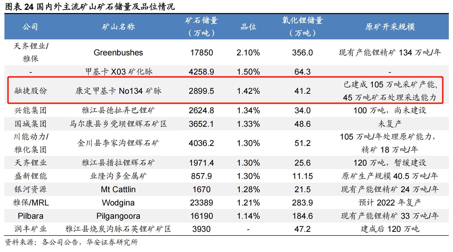 锂精矿方面,融捷股份目前拥有康定甲基卡锂辉石矿区134号矿脉的整体采矿权,证载储量2899.5万吨,目前具有105万吨/年矿石开采能力及45万吨/年矿石处理的选矿能力,现有产能满产时锂精矿产量约为7万-8万吨/年。华安证券研报显示,该矿脉品位不俗,氧化锂储量月41.2万吨,折合碳酸锂当量102万吨。(按照氧化锂和碳酸锂当量转换系数1:2.47计算)