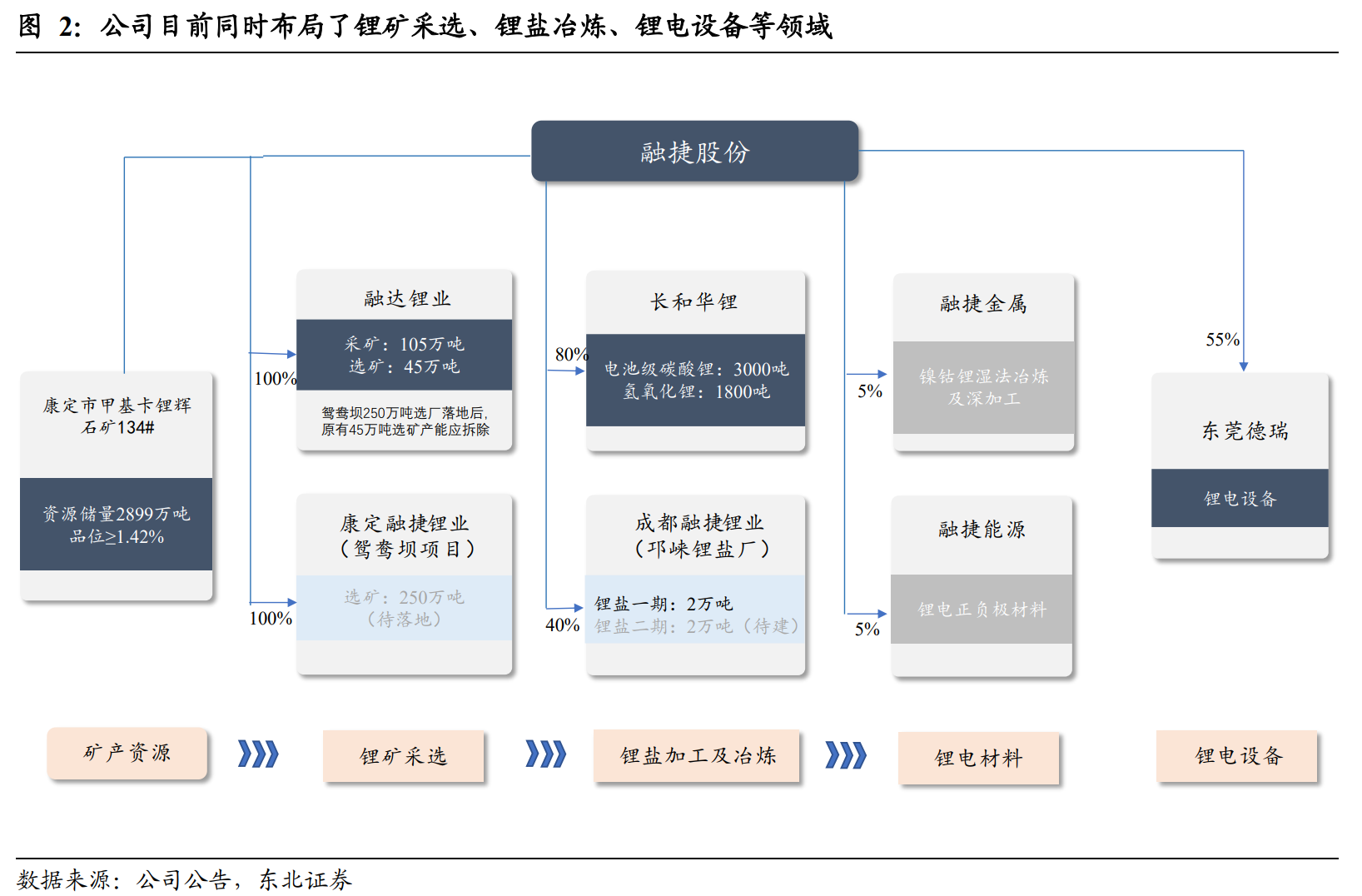 据东北证券研报资料,公司现有电池级碳酸锂产能3000吨/年、氢氧化锂1800吨/年,并参股成都融捷锂业一期2万吨/年锂盐项目。公司6月9日公告,成都融捷锂业已《安全生产许可证》,按照计划,将在6月份结束试生产,7月份进入正式生产阶段。