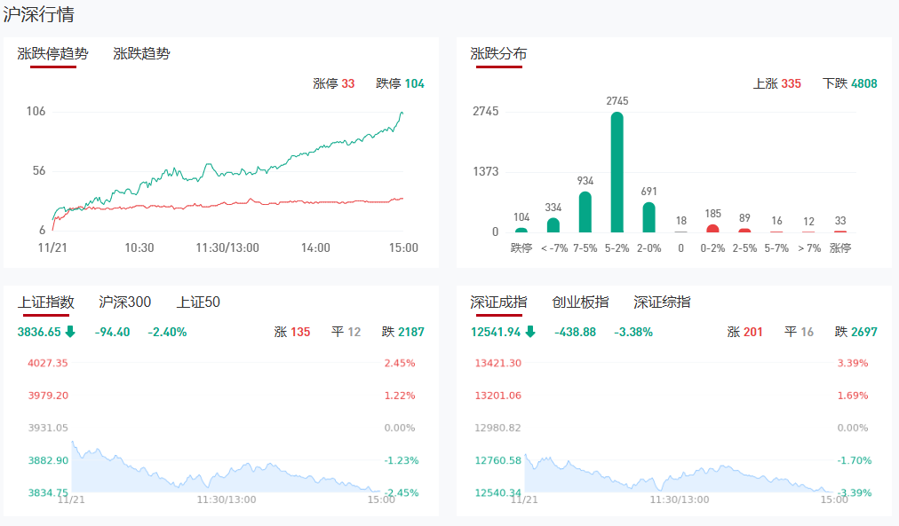 板块方面,中船系、AI应用等板块涨幅居前,电池、硅能源、锂矿等板块跌幅居前。截至收盘,沪指跌2.41%,深成指跌3.41%,创业板指跌4.02%。
