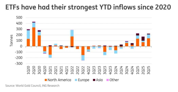对于2026年走势,ING银行维持乐观预期。报告认为,央行持续购金、特朗普贸易战持续、地缘政治风险高企、ETF持仓持续扩大以及美联储降息预期升温等因素将继续支撑金价上涨。随着美联储大概率继续降息,ETF购金需求有望进一步回升,当前持仓尚未达到2020年峰值,仍有增长空间。
