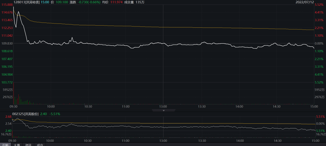 受益于此,7月12日洪涛股份和洪涛转债双双大涨开盘,涨幅均触及5%。未料到的是,此后抛盘无数,两只品种均以下跌收盘。从成交看,洪涛转债成交6.6亿元,换手率超过100%。