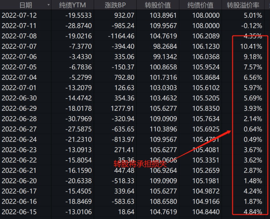更为清晰的是,由于转股溢价率为正,近期转股将承担不同程度的亏损。这点与海印转债末期有点类似。