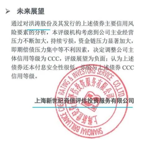 6月28日,新世纪评级将洪涛股份主体评级和洪涛转债评级均下调至CCC级。理由是公司主营业务压力不断,持续亏损,资金链压力显著加大。