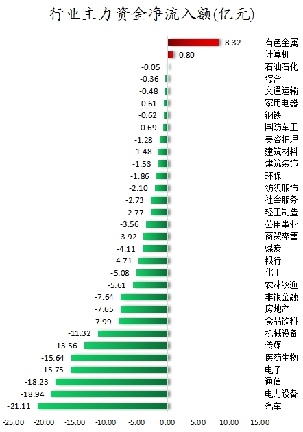 从行业板块来看,申万所属的31个一级行业,今日仅有有色金属、计算机2个行业板块主力资金呈现净流入,净流入金额分别为8.32亿元、0.8亿元。29个行业板块主力资金呈现净流出,其中,汽车行业板块主力资金净流出最多,净流出金额为21.11亿元;行业板块主力资金净流出靠前的还有电力设备、通信、电子、医药生物、传媒、机械设备,净流出金额分别为18.94亿元、18.23亿元、15.75亿元、15.64亿元、13.56亿元、11.32亿元。
