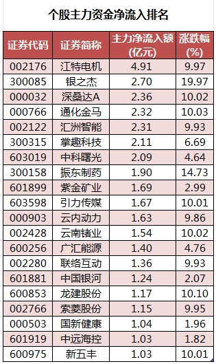 个股来看,今日有1977个股获主力资金净流入,其中,21股获主力资金净流入超1亿元。江特电机获主力资金净流入最多,净流入金额为4.91亿元;主力资金净流入居前的个股还有银之杰、深桑达A、通化金马、汇洲智能、掌趣科技,流入金额分别为2.7亿元、2.36亿元、2.32亿元、2.31亿元、2.11亿元。