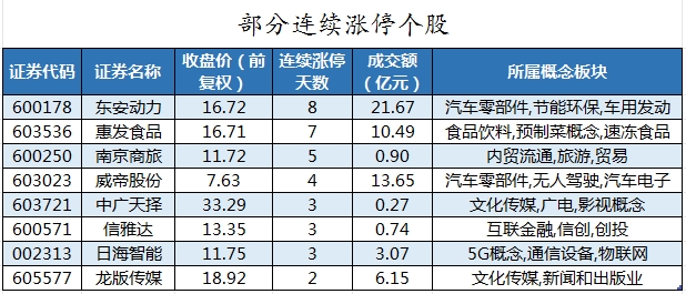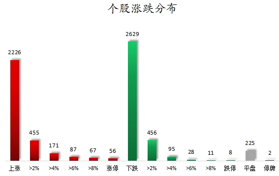 截至收盘,沪深两市合计2226只个股上涨,2629只个股下跌,平盘个股225只,停牌的个股2只。不含当日上市新股,共有56只个股涨停,8只个股跌停。连续涨停天数看,连续涨停天数超过2天的个股有18只。其中,东安动力已连收8个涨停板,连续涨停板数量最多。