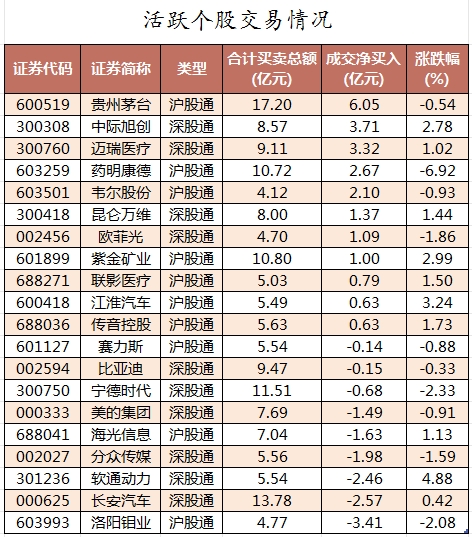 活跃个股方面,北向资金今日净买入较多的有贵州茅台、中际旭创、迈瑞医疗、药明康德、韦尔股份,净买入金额分别为6.05亿元、3.71亿元、3.32亿元、2.67亿元、2.1亿元。北向资金净卖出较多的有洛阳钼业、长安汽车、软通动力、分众传媒、海光信息,净卖出金额分别为3.41亿元、2.57亿元、2.46亿元、1.98亿元、1.63亿元。