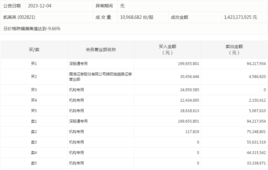 凯莱英今天跌停。盘后数据显示,7家机构出现在龙虎榜单上,合计净卖出1.5亿元;国信证券股份有限公司绵阳临园路证券营业部买入3045.64万元,同时卖出458.68万元。