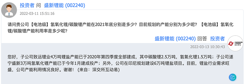 盛新锂能3月13日在投资者互动平台表示,子公司致远锂业4万吨锂盐产能已于2020年第四季度全部建成,其中碳酸锂2.5万吨,氢氧化锂1.5万吨;子公司遂宁盛新3万吨氢氧化锂产能已于今年1月建成投产;另外,公司在印尼规划建设6万吨锂盐项目。