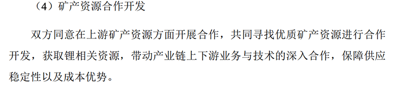 同时,双方约定,双方同意在上游矿产资源方面开展合作,共同寻找优质矿产资源进行合作开发,获取锂相关资源,带动产业链上下游业务与技术的深入合作,保障供应稳定性以及成本优势。
