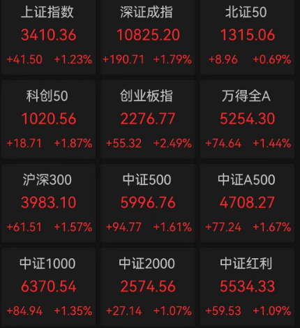 早盘,A股市场全线走高,截至午间收盘,上证指数涨1.23%,并且重新站上3400点;深证成指上涨1.79%,创业板指大涨2.49%,早盘成交额达到1.17万亿元,较昨日早盘放量超2000亿元。从主要股指来看,双创板块指数领涨,创业板50、创价值、深创100、科创创业50涨幅均在2%以上。市场上涨个股近4000只,下跌个股1200余只。