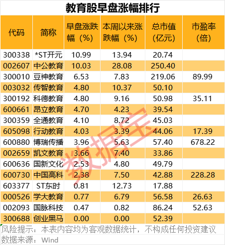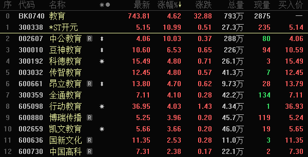 教育板块再度冲高,行业指数领涨,龙头中公教育二连涨停,*ST开元、豆神教育、传智教育涨幅居前。