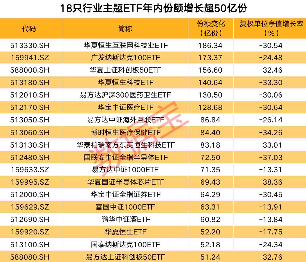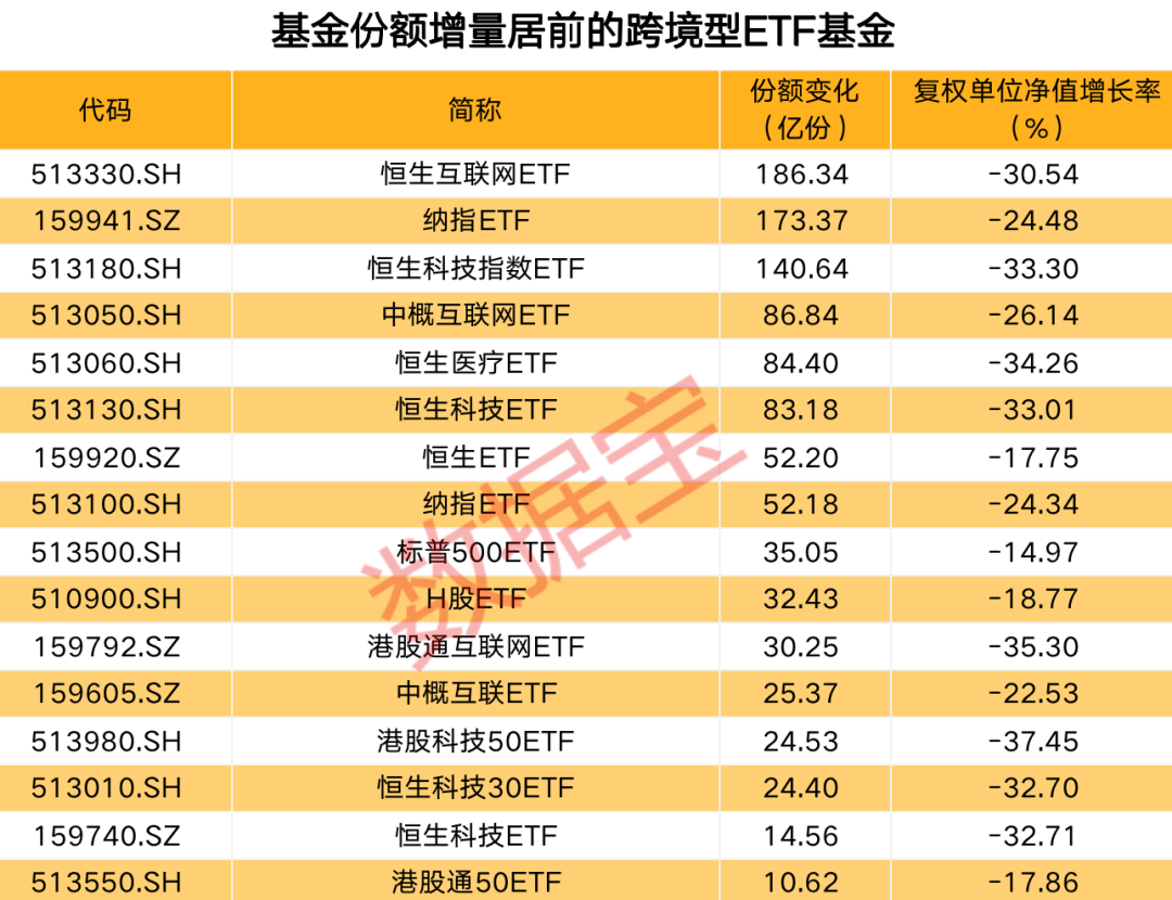 恒生互联网ETF(513330)基金份额年内增长186.34亿份,增量最大,份额变化率达56.42%;博时恒生医疗保健ETF(513060)等16只跨境ETF基金份额增长率超100%。