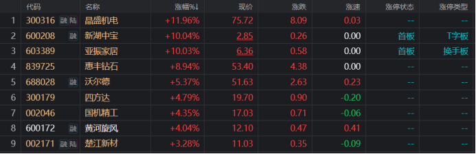 今日(8月15日)早盘,培育钻石板块大幅走强,截止午间收盘,板块指数涨近4.6%,且领涨两市,个股方面,总市值近千亿元的晶盛机电大涨近12%,新湖中宝、亚振家居涨停,北交所人气股惠丰钻石与热门培育钻石股沃尔德、四方达、国机精工、黄河旋风等股均涨幅居前。