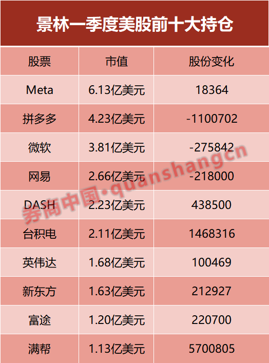 截止一季度末,景林的美股持仓总市值达32.26亿美元(约合人民币233亿元),较去年底的28亿美元,增幅达15%。前十大重仓股为META、拼多多、微软、网易、Doordash、台积电、英伟达、新东方、富途、满帮。