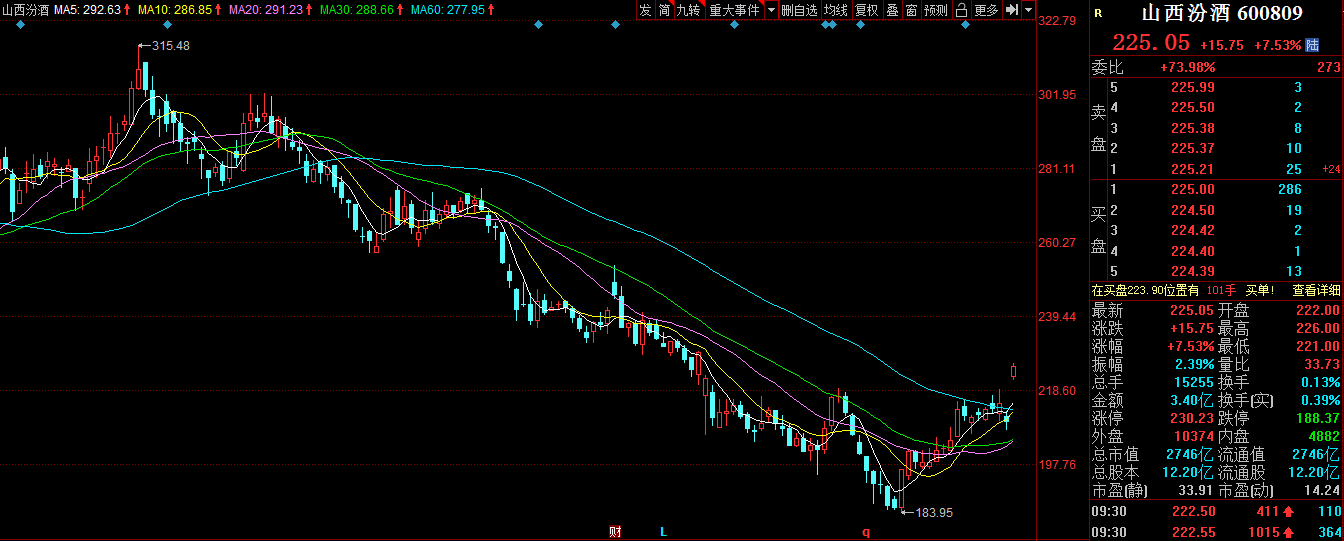 7月25日,山西汾酒高开,截至发稿,股价报225.05元,涨7.53%。