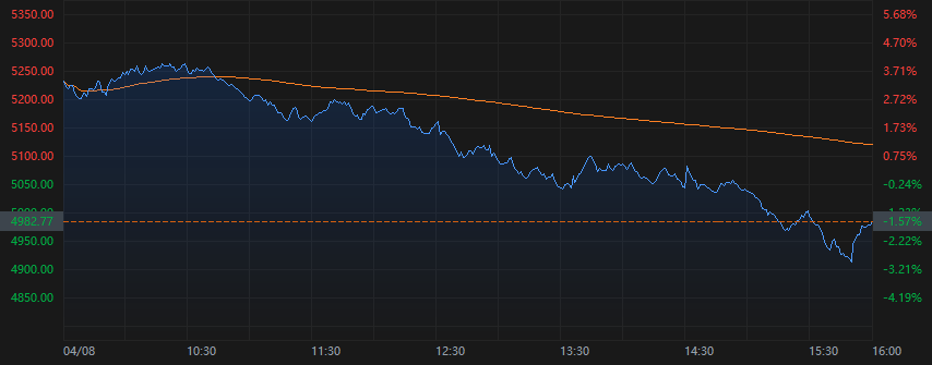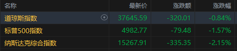 截至收盘,道琼斯指数跌0.84%,报37,645.59点;标普500指数跌1.57%,报4,982.77点,自去年4月以来首次收于5,000点下方;纳斯达克综合指数跌2.15%,报15,267.91点。