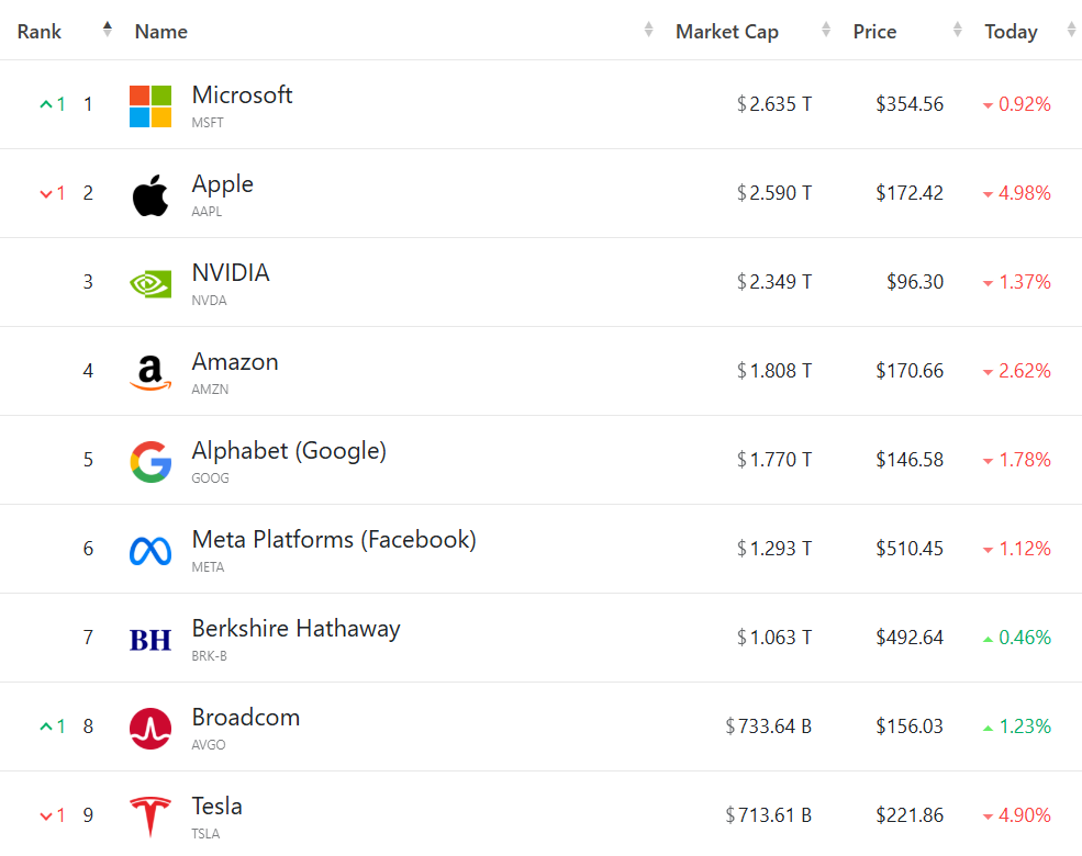 “七巨头”集体走低,(按市值排列)微软跌0.92%,苹果跌4.98%,英伟达跌1.37%,亚马逊跌2.62%,谷歌C跌1.78%,Meta跌1.12%,特斯拉跌4.9%。