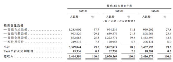 从收入结构来看,公司的收入较为依赖智能设备销售,盈利模式较为单一。2022-2024年,商米科技销售智能设备的收入分别为33.89亿元、30.08亿元、34.38亿元,占当期总营收的比例分别为 99.5%、98%、99.5%。