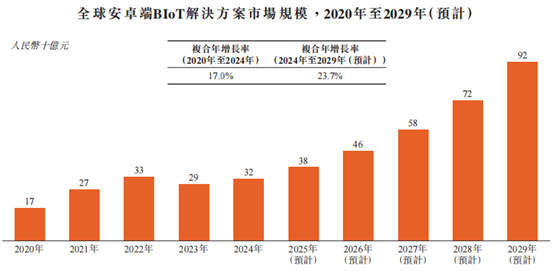 其中,安卓端BIoT解决方案是指将物联网、AI及大数据技术集成到硬件和软件系统中,以供商业使用。在商米科技所处的安卓端BIoT赛道,2024年全球市场规模约为人民币320亿元,预计到2029年将达至约920亿元,2024年至2029年的复合年增长率预计将为23.7%。预期安卓端BIoT解决方案在全球市场的渗透率将由2024年的约14%提高至2029年的约29%。