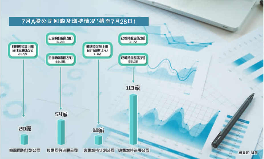 据上海证券报记者统计,截至7月28日19时,本月共有20家公司推出回购方案,拟回购金额上限达21.94亿元;54家公司披露股份回购情况,回购股数合计达8.28亿股,回购总金额为66.32亿元。此外,18家公司披露了增持计划,拟增持金额上限为7.82亿元;113家公司披露股份增持情况,合计增持股数约为3.72亿股,金额55.12亿元。
