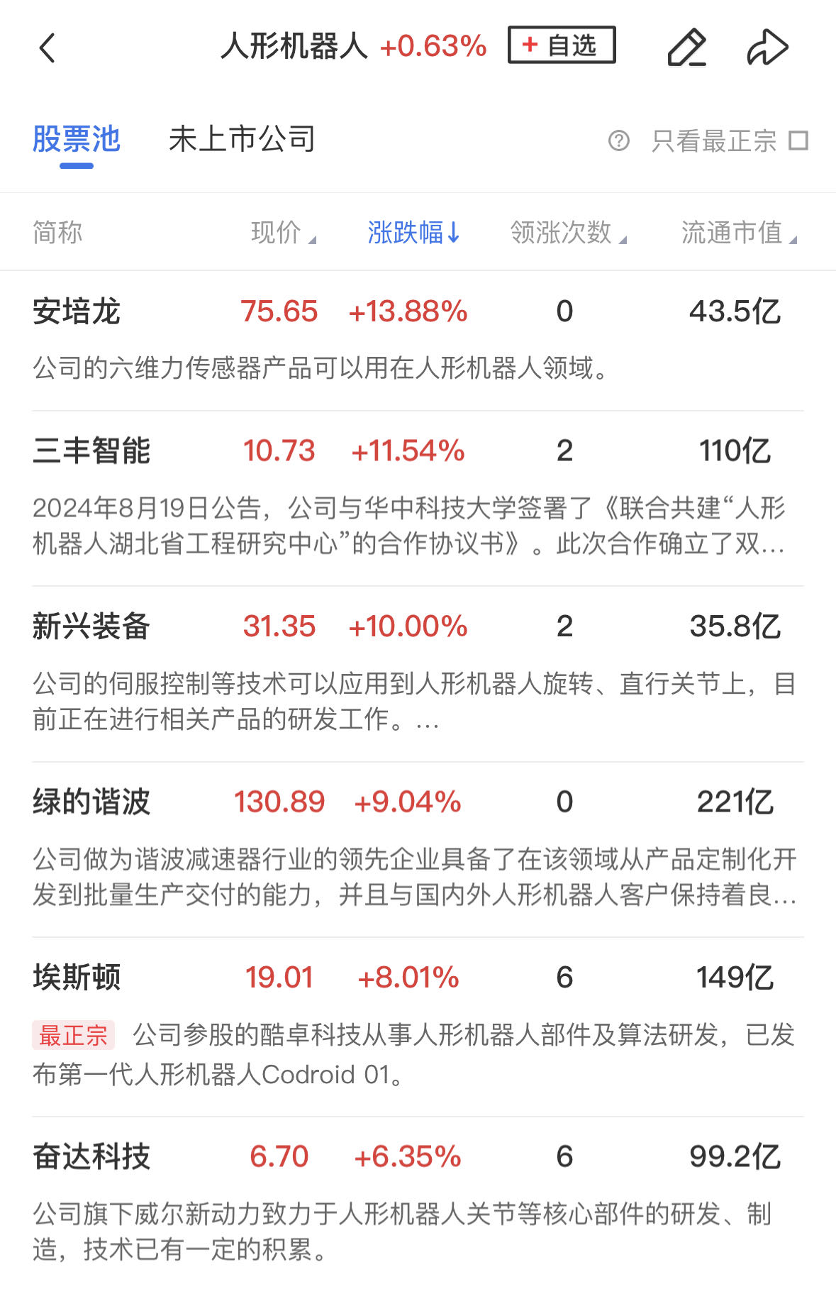 人形机器人概念股持续活跃,新兴装备,盛通股份涨停,安培龙、三丰智能、绿的谐波、埃斯顿、奋达科技等个股涨幅居前。