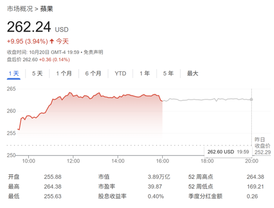 由于人们对iPhone销售的乐观情绪重燃,苹果股价周一大涨,盘中创下264.38美元的新高。截至收盘,上涨3.94%,收于创纪录的262.24美元。
