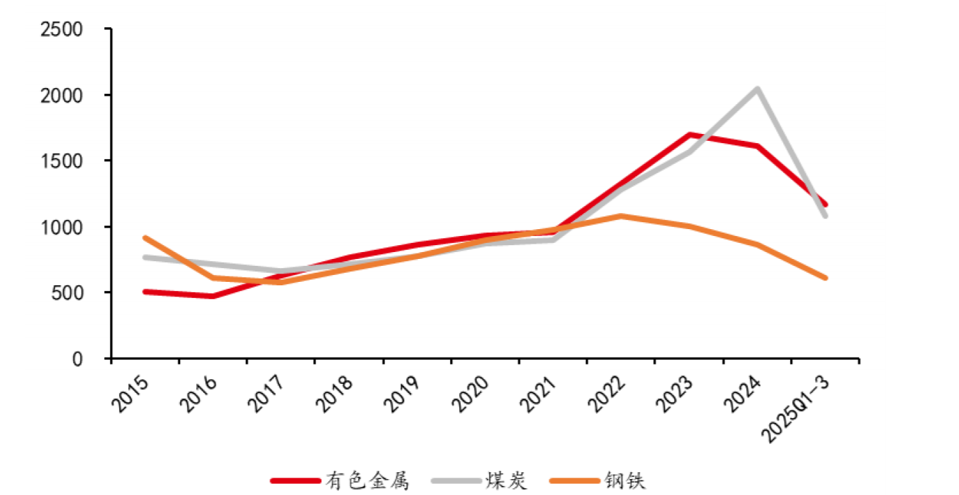 矿物:我国矿物及加工主要行业资本开支整体呈上涨趋势。2024年有色金属/煤炭/钢铁行业资本开支分别为1613/2043/866亿元,2025Q1-3有色金属/煤炭/钢铁行业资本开支分别为1169、1086、609亿元,除煤炭行业因为煤价影响资本开支有所走弱外,有色金属、钢铁资本开支仍维持较高水平。