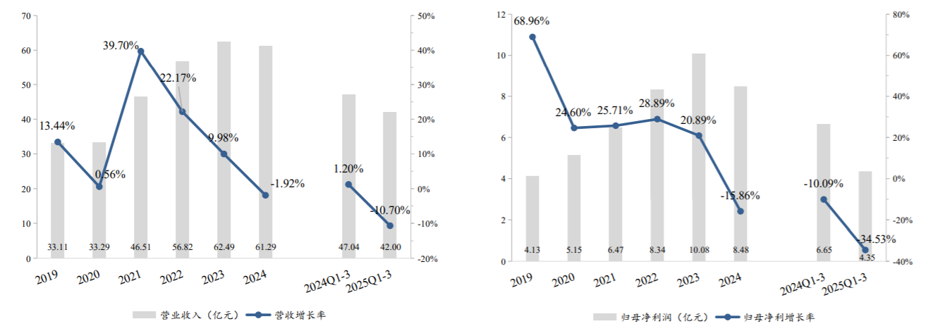 图:2019-2025Q3公司营业收入及增速(左),2019-2025Q3公司归母净利润及增速(右) |