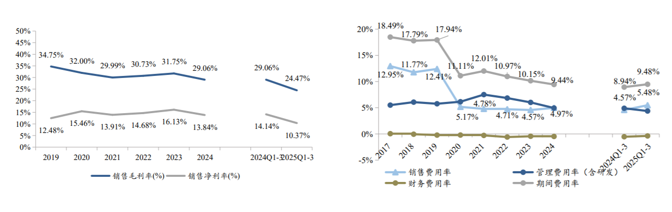 图:2019-2025Q3公司利润率情况(左),2017-2025Q3公司费用率情况(右) |