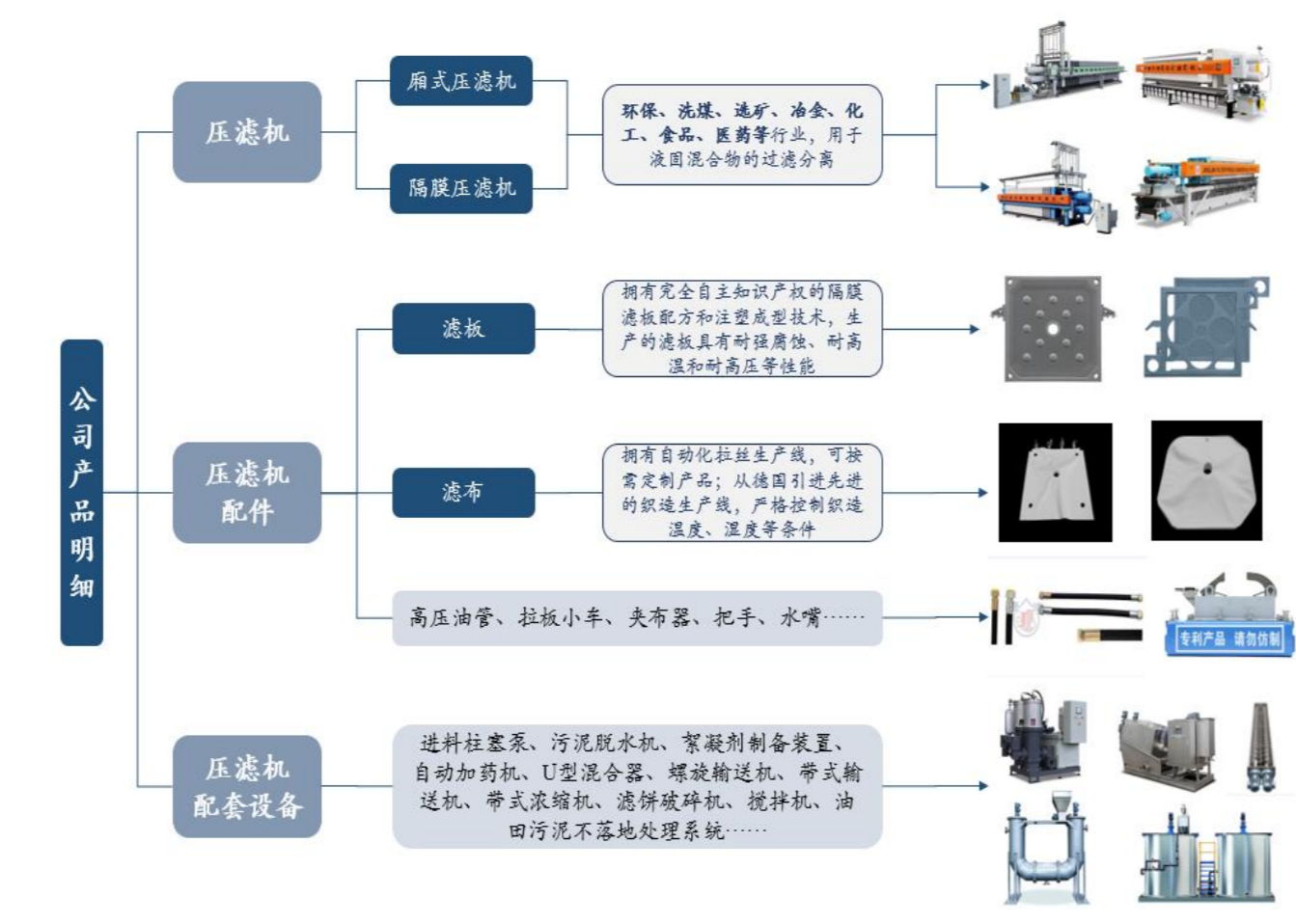 从产品结构看,公司聚焦于压滤领域的全产业链布局,公司产品以各式压滤机为主,同时致力于各式压滤机配套设备的生产和销售。公司构建了以压滤机整机为核心,滤板及滤布等关键配件为支撑的业务架构,致力于为客户提供“交钥匙”级过滤成套解决方案。