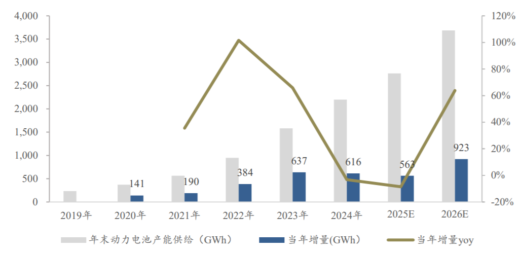 图:预计2026年锂电有效产能扩产增速回正 |