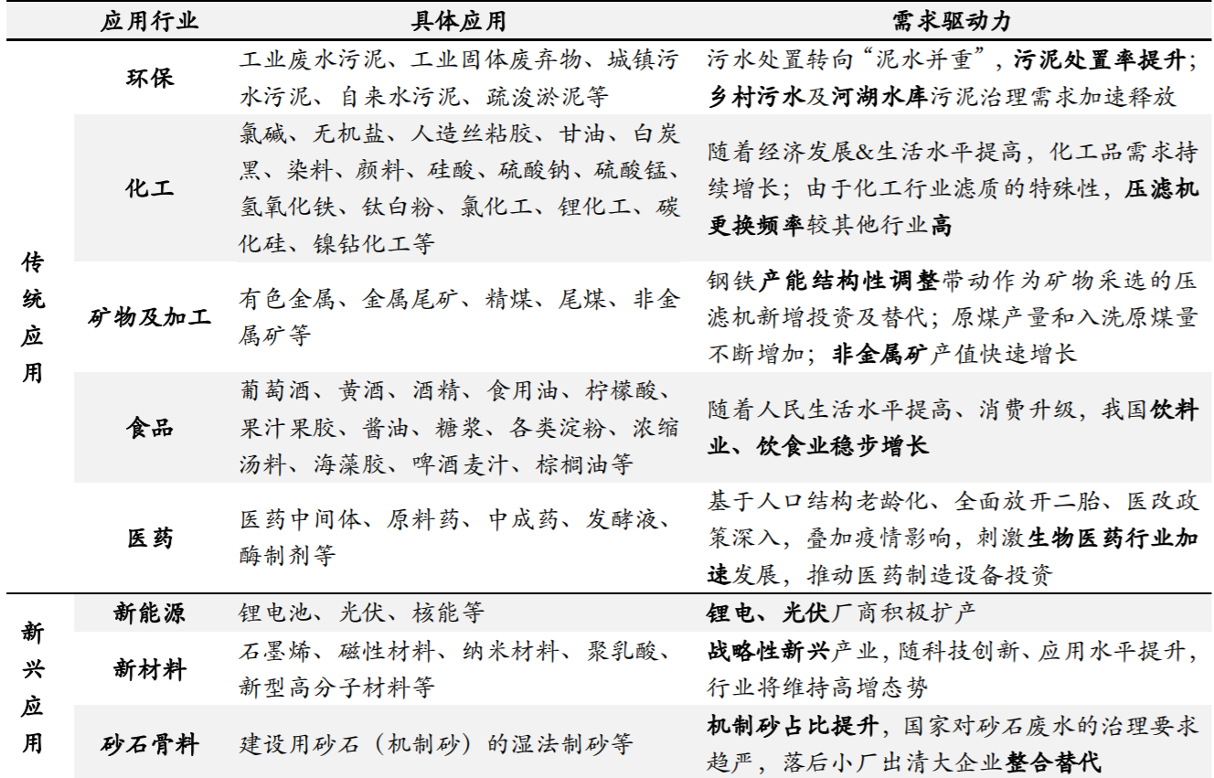 从下游应用看,公司持续拓展压滤机下游应用场景,新兴赛道更具竞争优势。压滤机作为一种常用的固液分离设备,广泛应用于环保、矿物加工、化工、食品、医药等诸多领域,同时在新能源、新材料、砂石废水等新兴领域实现拓展。在新能源新材料、新兴化工等新兴细分应用行业,过滤物料更为复杂,对压滤机的要求更加严格,龙头企业更具竞争优势。