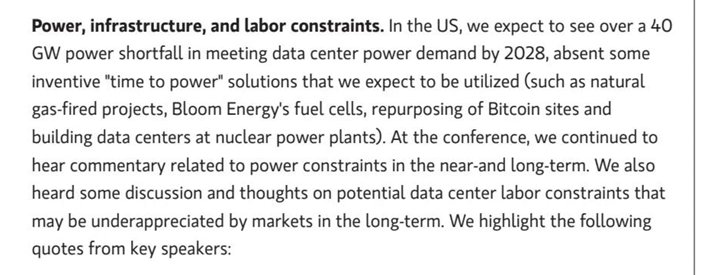 摩根士丹利预计美国到2028年数据中心电力缺口超40GW,需通过天然气发电、燃料电池(比如Bloom Energy的燃料技术)、比特币矿场改造、核电站配套数据中心等方案解决。