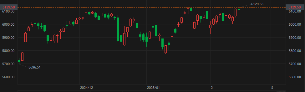 标普500指数涨0.24%,报6,129.58点,刷新了1月23日录得的收盘历史纪录,尾盘也一度升至6129.63点历史新高。