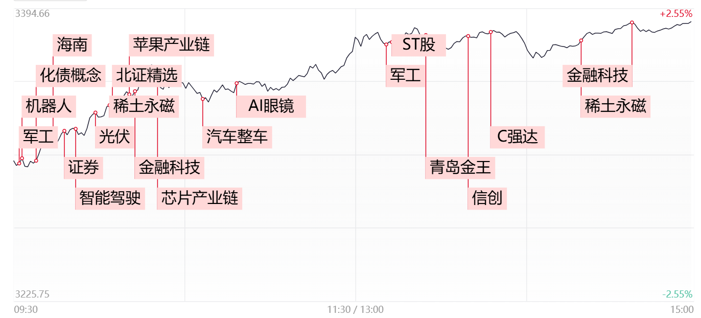 ②盘面上,大金融板块再度领涨,军工概念股掀涨停潮。此外,软件、半导体、消费电子等科技股方向同样表现不俗;